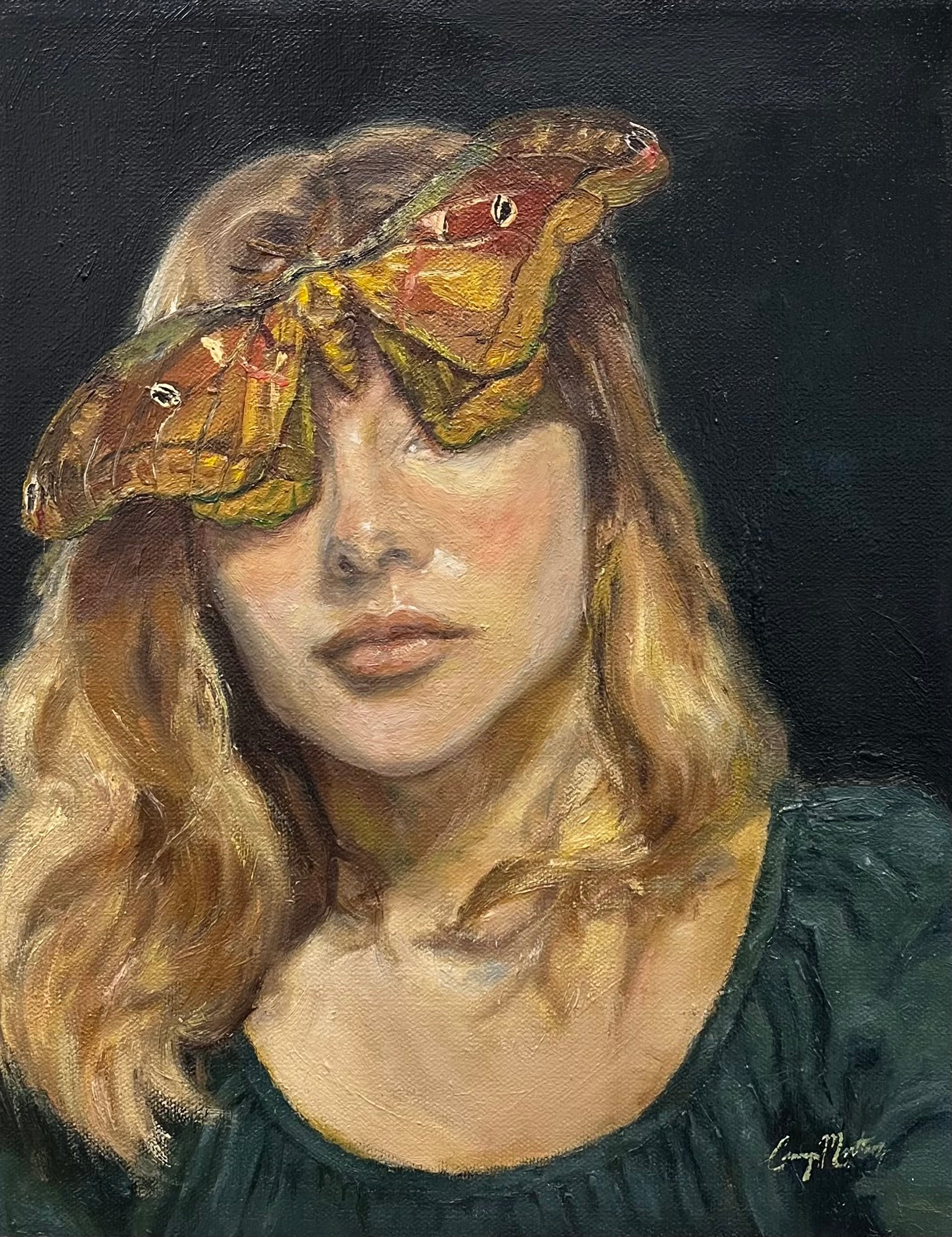 "Cover" is an artist self portrait with the artist's eyes covered by a Polyphemus moth.