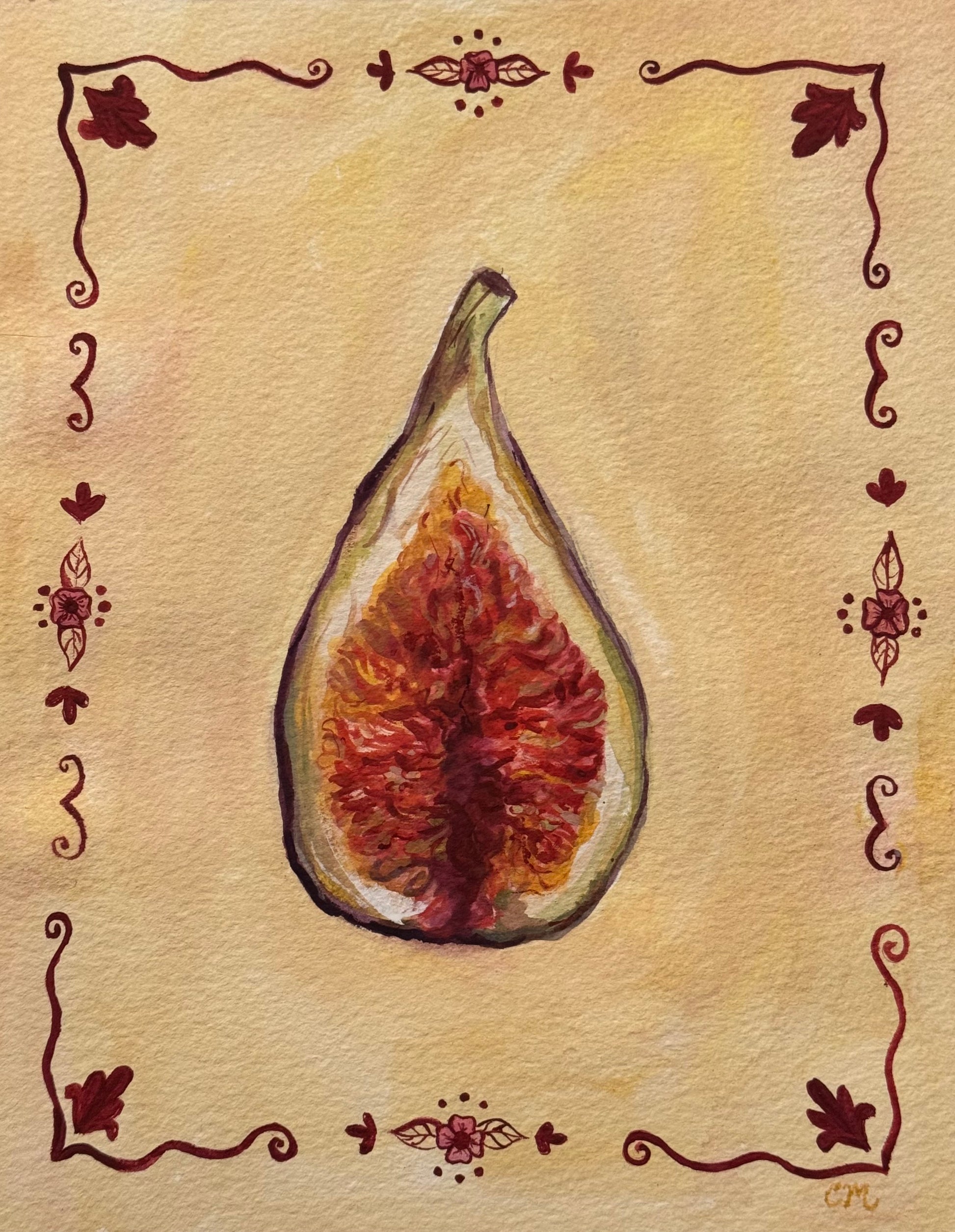 8"x10" watercolor and gouache painting of a fig with a decorative border. Completed on paper. NOT ready to hang.
