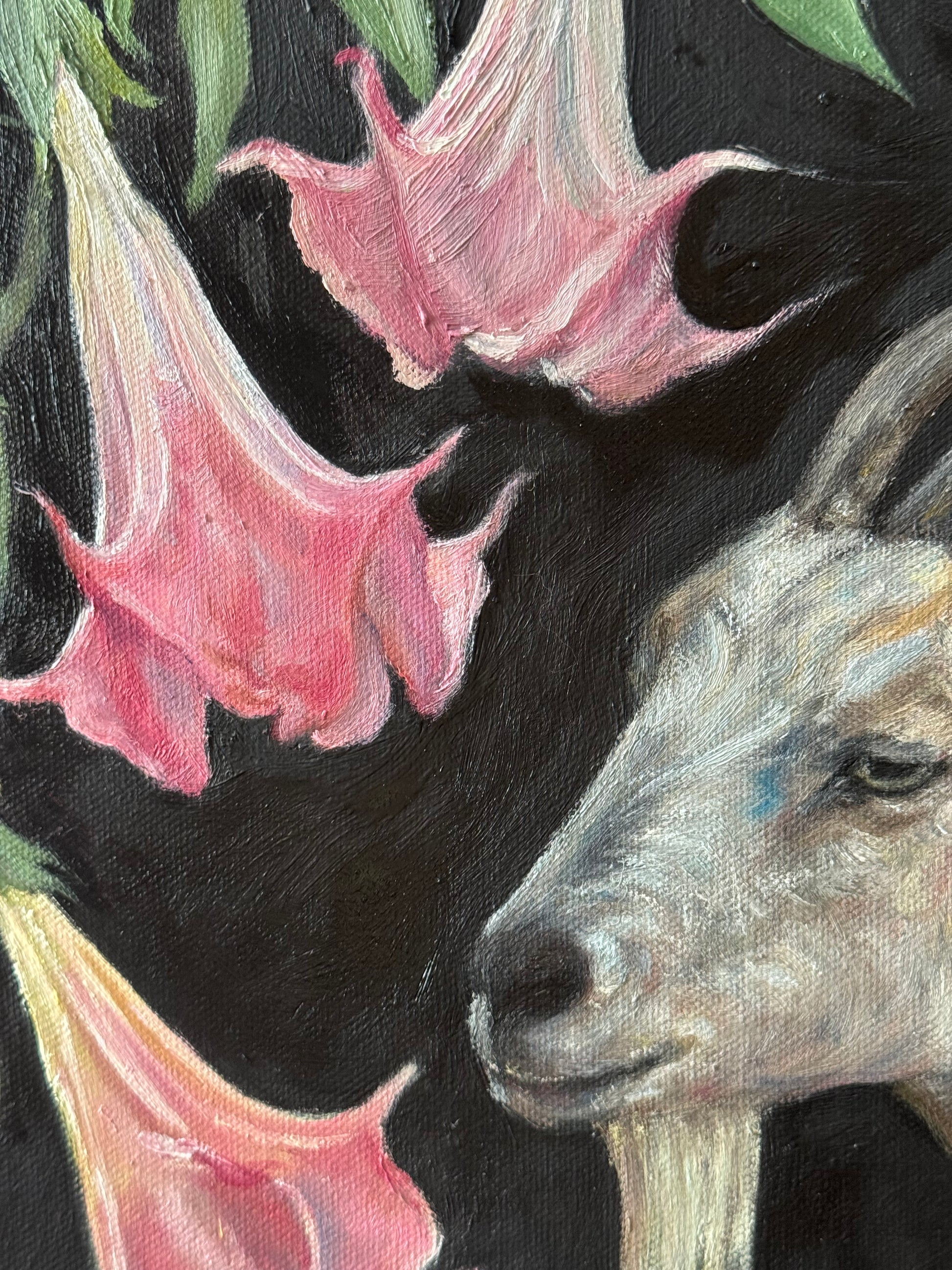 "Memento Mori" depicts a horned goat surrounded by Angel's Trumpet flowers.